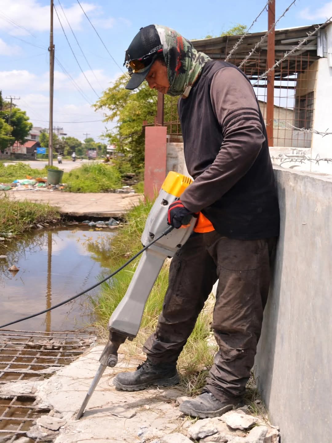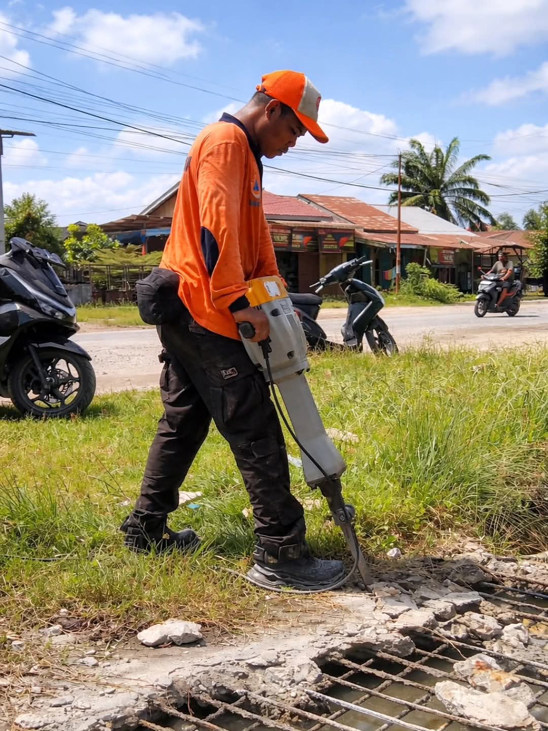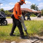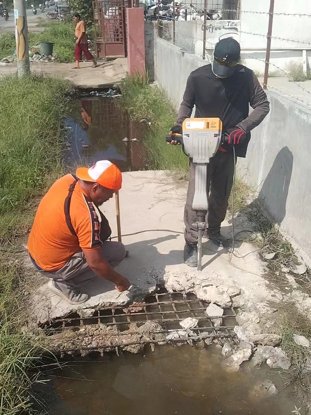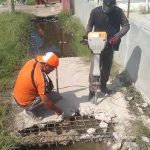 Pembukaan beton penutup drainase kali ini dilakukan pada titik lokasi yang mengalami sedimentasi parah, dipenuhi lumpur dan genangan air. Kondisi tersebut menyebabkan aliran tersumbat sehingga diperlukan akses maksimal untuk proses pengerukan menggunakan alat berat.