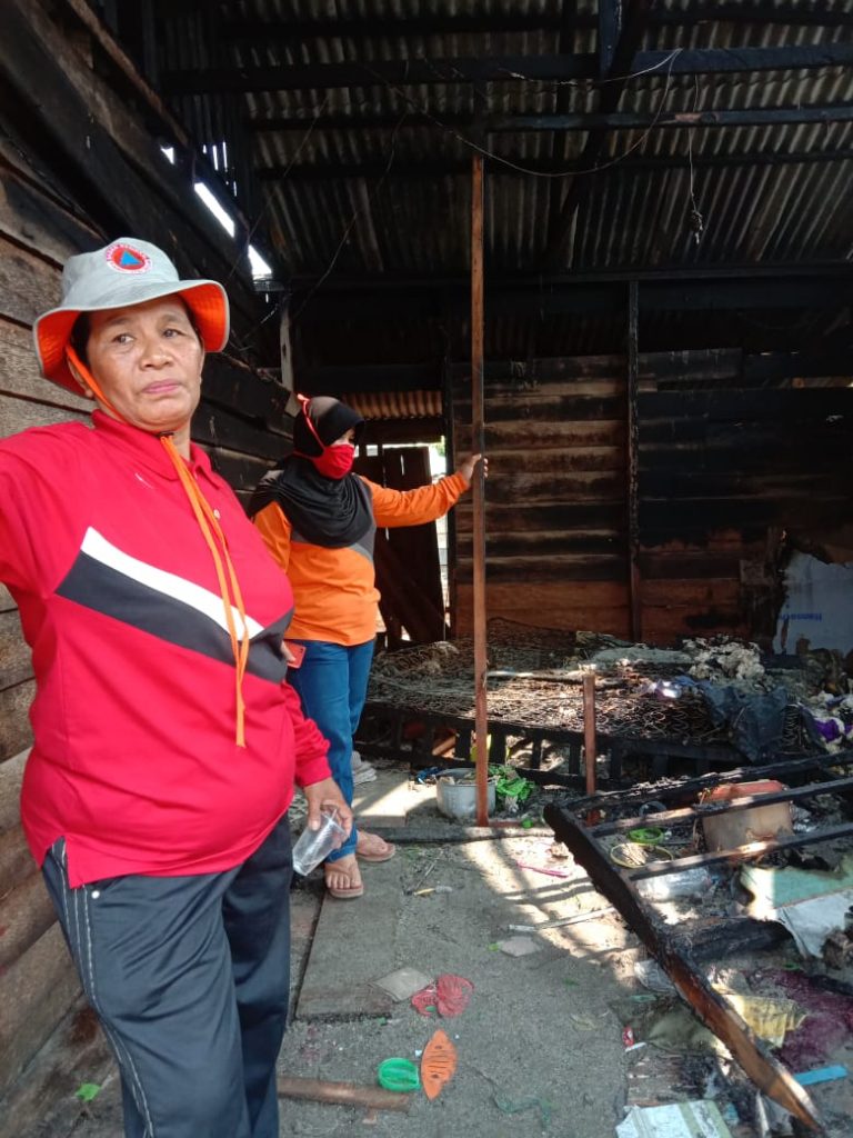 Ibu kabid dan ibu kasubbid berkoordinasi dengan kepling di lingkungan tersebut dalam memberikan bantuan sembako kepada korban kebakaran.